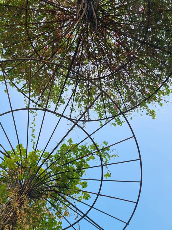In rural France, some eco-gardeners use umbrella frames to train grapevines. Over time, the plants weave through the metal arms, creating a lush, circular canopy.